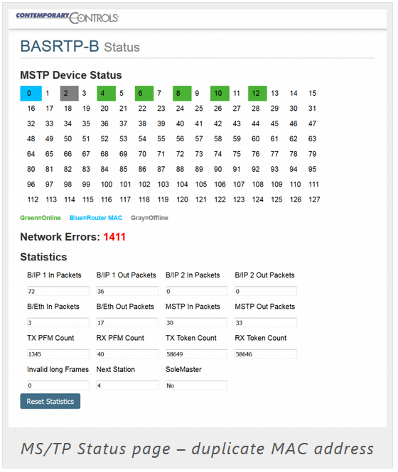 The BASrouter has a resident web server which allows for commissioning and troubleshooting using a standard web browser. Using the Status page (shown below), it is possible to troubleshoot a segment further. The Status screen is always operational and keeps tabs on activity. It consists of an MS/TP Device Status table with color-coded blocks for each device, Network error counts are shown in red, along with router traffic statistics below. The Status page will automatically refresh every 5 seconds with the updated status on networks and devices so you can observe network state changes and gain insight into the condition of the BACnet network at any time.
