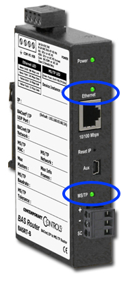 The most basic, and really the first step to troubleshooting your BACnet network using the BASrouter is to look at the Ethernet and MS/TP Receive LED lights on the front of the device. These lights are a good indicator of network activity. A bicolor Ethernet LED glows green for 100 Mbps, and yellow for 10 Mbps, and indicates activity by flashing. The MS/TP Receive green LED flashes rapidly when valid MS/TP traffic is received. When flashing continuously and without interruptions, the LED is a good indicator that the MS/TP network is operational. If there are long interruptions in the MS/TP Receive LED, you may have some issues on the MS/TP segment.