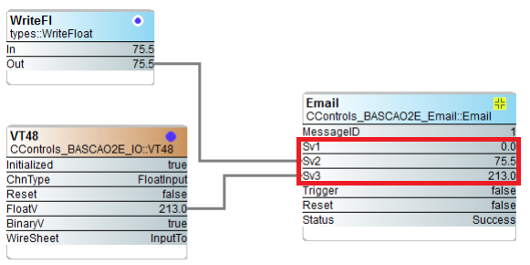 Sv1, Sv2 and Sv3 can be tied directly to wiresheet data and used to send values in the message body which are not physical I/O points or Virtual Points, but are values sampled directly from wiresheet logic.