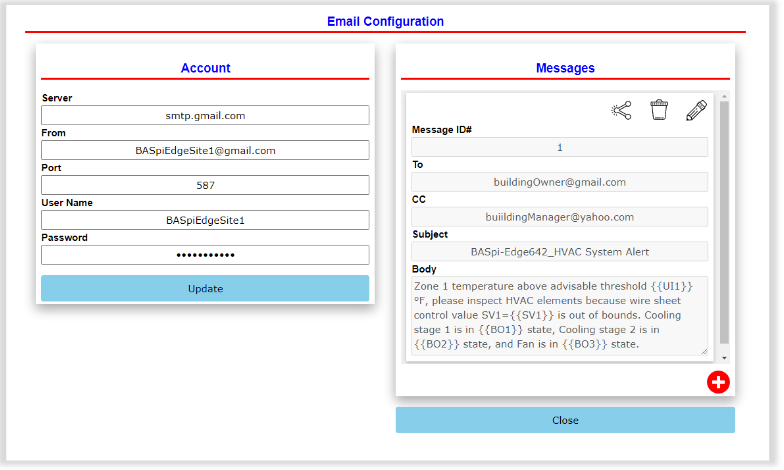Actual point values sampled at the time of triggered sent email can be included in the message body using curly braces around a point name and instance, and BASpi-Edge real, virtual, and up to three Sv wiresheet values.