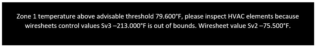 "Zone 1 temperature above advisable threshold {{UI1}} °F, please inspect HVAC elements because wiresheet control value SV3={{SV3}} °F is out of bounds. Wiresheet value SV2={SV2}} °F."