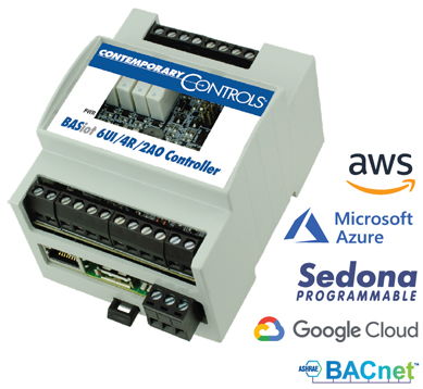 Its built-in isolated RS-485 port delivers BACnet client/server communication for BACnet MS/TP. The controllers are also fully web page configurable over Ethernet with quick and easy cloud connectivity. The controllers are open, non-proprietary, and easily programmed for systems integrator applications using Sedona open-source, drag and drop programming which is available with Contemporary Controls' free BAScontrol Toolset.