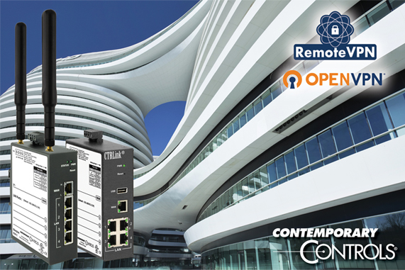 Hosted on the Internet and maintained by Contemporary Controls, the RemoteVPN subscription service incorporates a cloud-based OpenVPN server, OpenVPN clients for workstations and mobile devices, and OpenVPN IP routers installed at the job site.