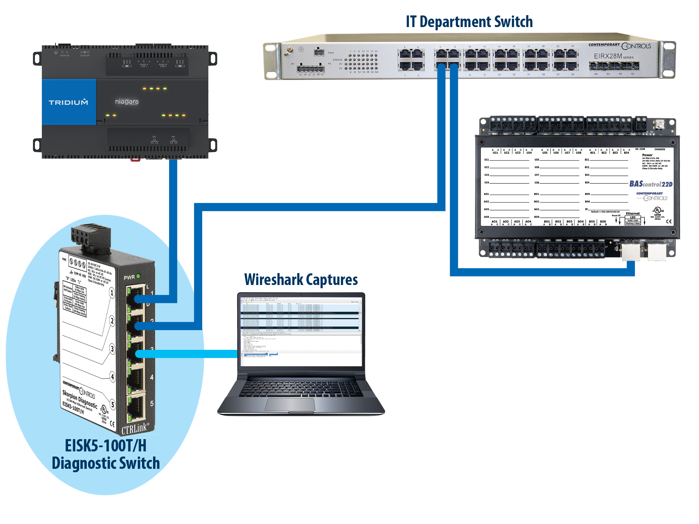 You can capture BACnet/IP messages using Contemporary Controls' Skorpion Diagnostic Switch that is connected to a PC running Wireshark. By placing the Diagnostic Switch between any BACnet/IP device and the rest of the network (as shown in Figure 1), you can capture transmitted or received BACnet/IP messages. These messages can provide a wealth of data for equipment vendors to help diagnose issues with the equipment in your facility. In Figure 2, all traffic to/from the controller is monitored, allowing you to analyze communication issues that may occur with the controller. In Figure 3, all traffic to/from the Jace is monitored, allowing you to analyze communication issues that may occur with the Jace.
