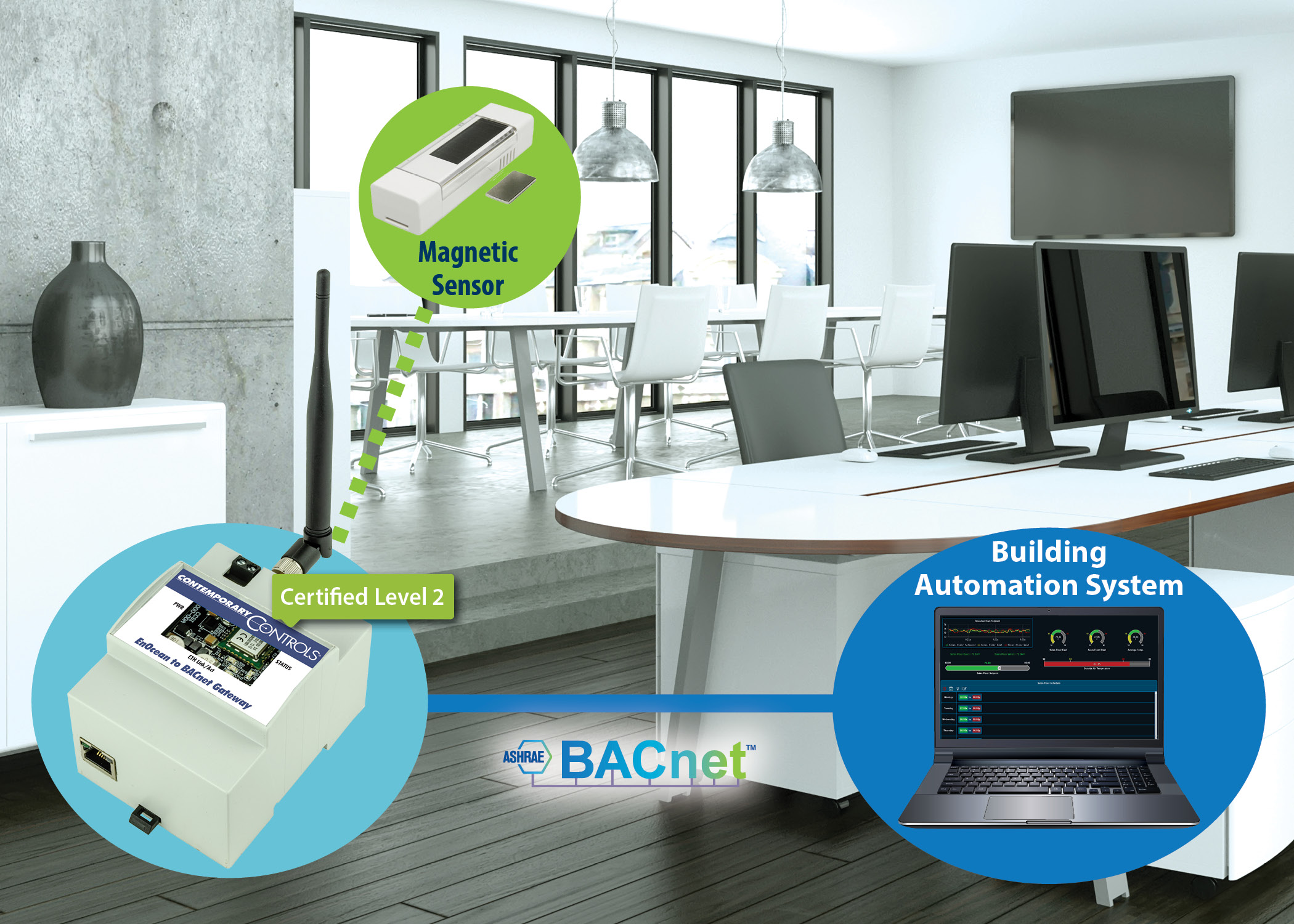 Traditional monitoring methods that rely on wired sensors can present complex installation requirements and limited flexibility. A modern window monitoring system that uses EnOcean wireless solar-powered window sensors and BACnet gateway devices offers a solution that improves energy efficiency, increases building security, and ensures optimal building management.
