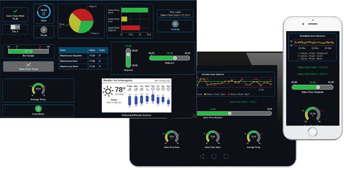 BASview3 is a stand-alone, embedded, web-based graphical interface for building automation and process automation systems. It can be accessed from any web browser providing client functionality to any BACnet/IP or Modbus TCP system. By using BASrouter or BASgateway products, additional protocols such as BACnet MS/TP and Modbus RTU can be integrated. Supervisory features include animated graphic screens, scheduling, historical trending, runtime accumulation and email alarms/notifications. The BASview3 is totally self-contained, requiring no external PC or application for its use. Multiple web browser users can access the device simultaneously. It is ideal for medium-sized buildings or processes that require an easy and intuitive to use graphical interface with no licensing requirements.